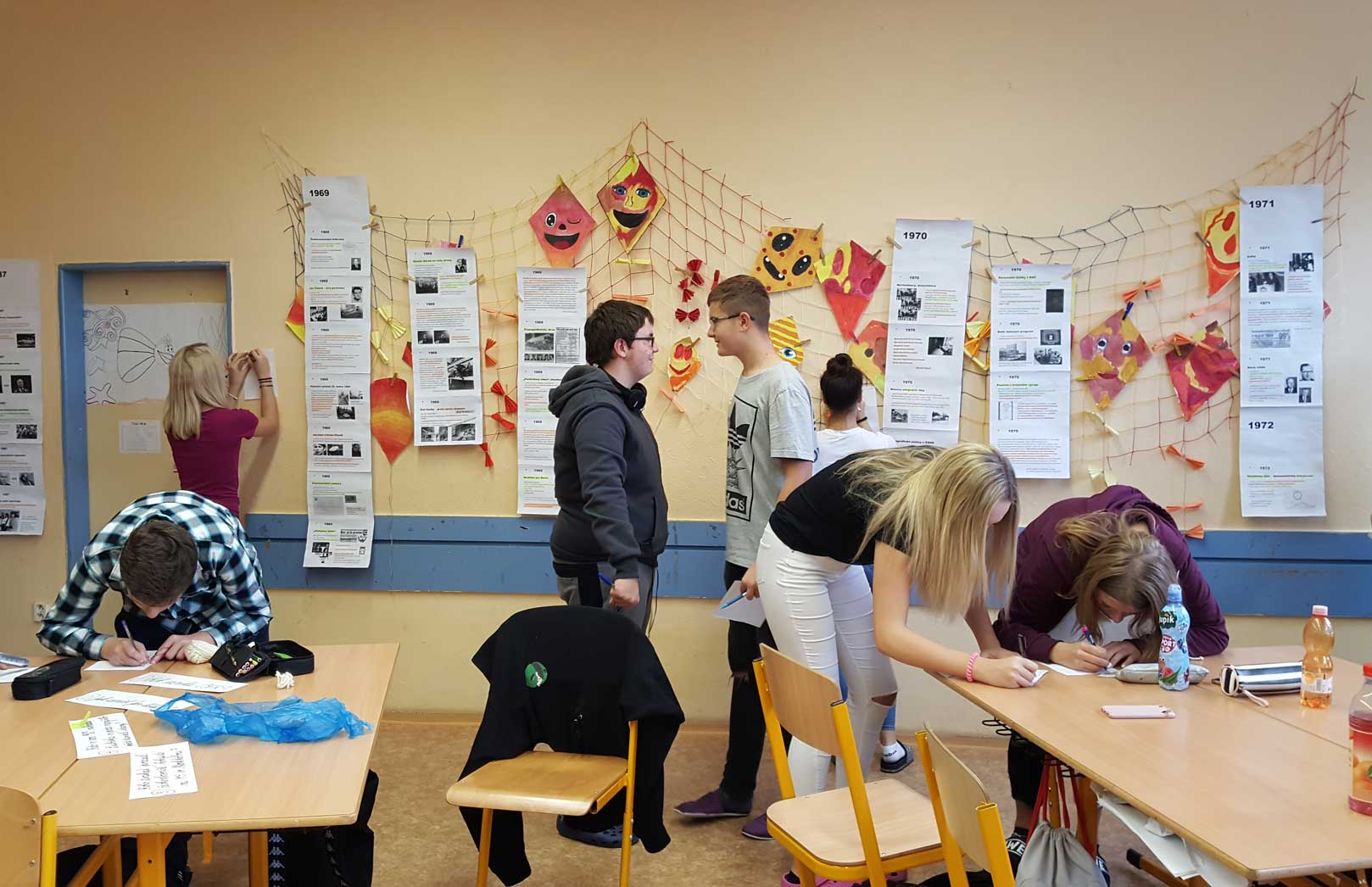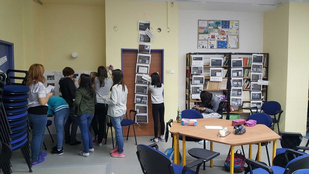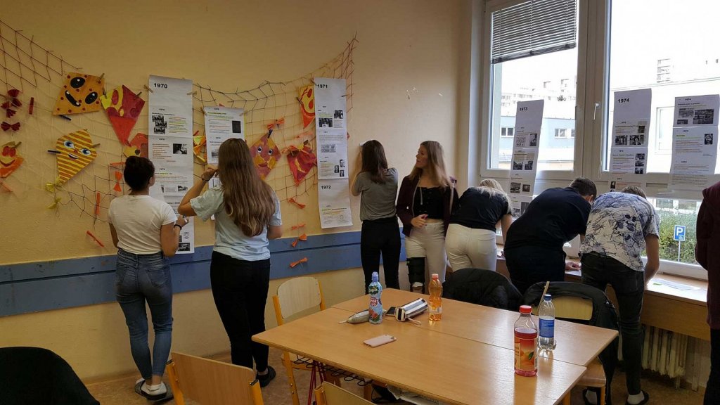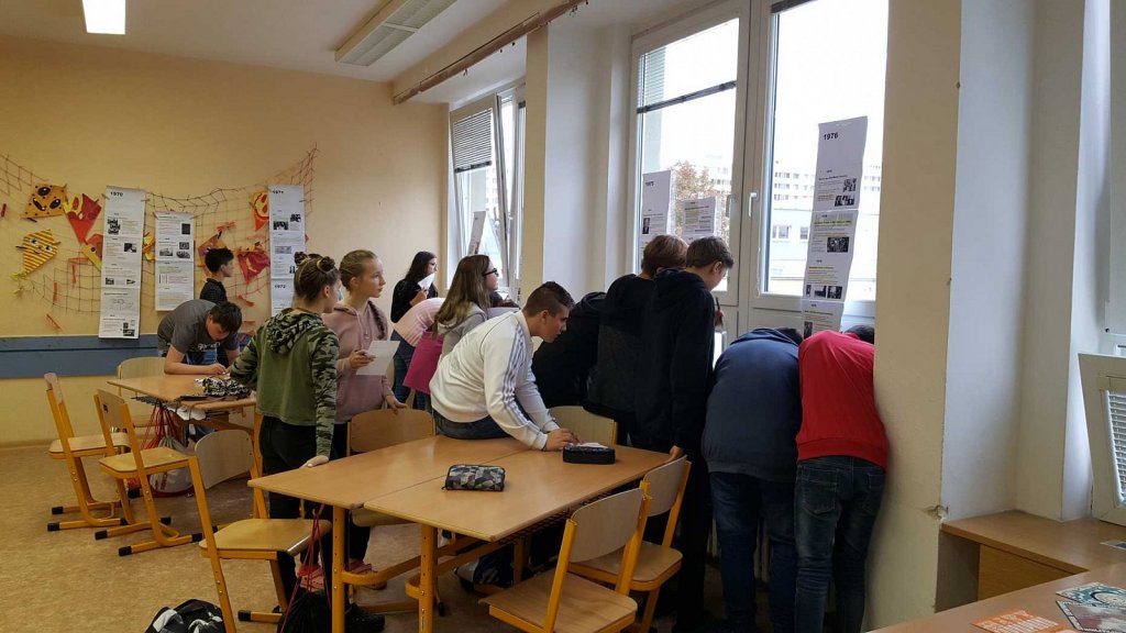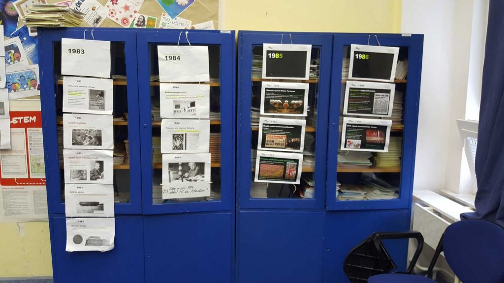 V multimedilální učebně a v učebně 7.A čekalo na žáky Československo mezi lety 1969-1989. Na panelech měli žáci vytištěné události jednotlivých let tohoto období. K významným událostem měli žáci vypsané otázky. Odpověď na každou z nich si nalezli v textu. Kdo odpověděl správně na všech 25 otázek, dostal odměnu a některé byly i sladké.