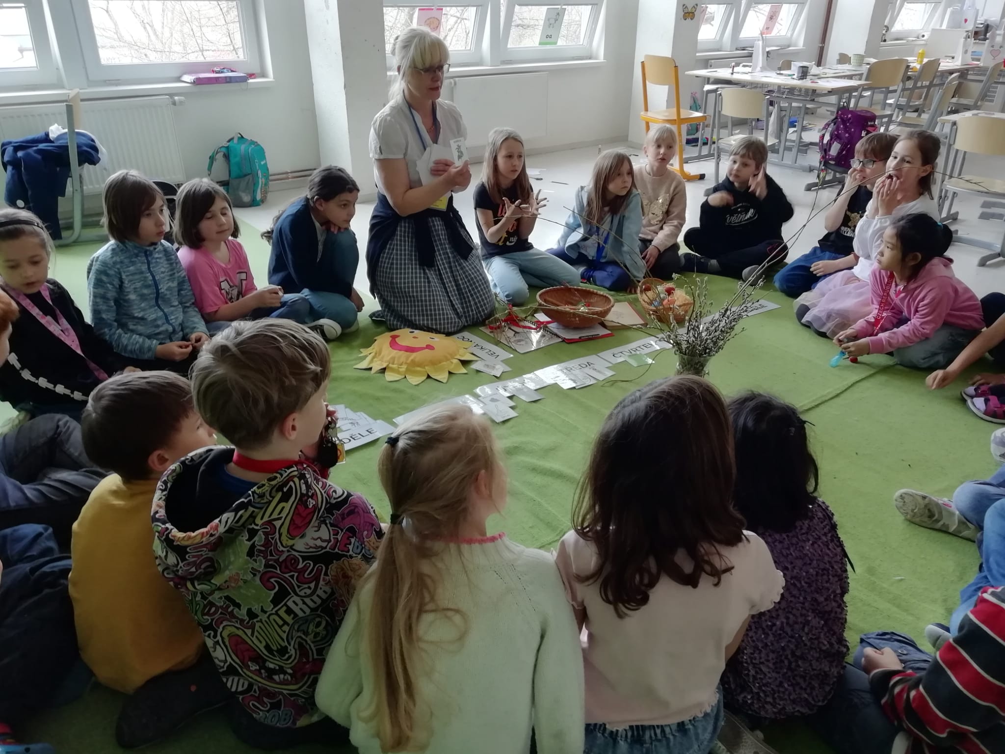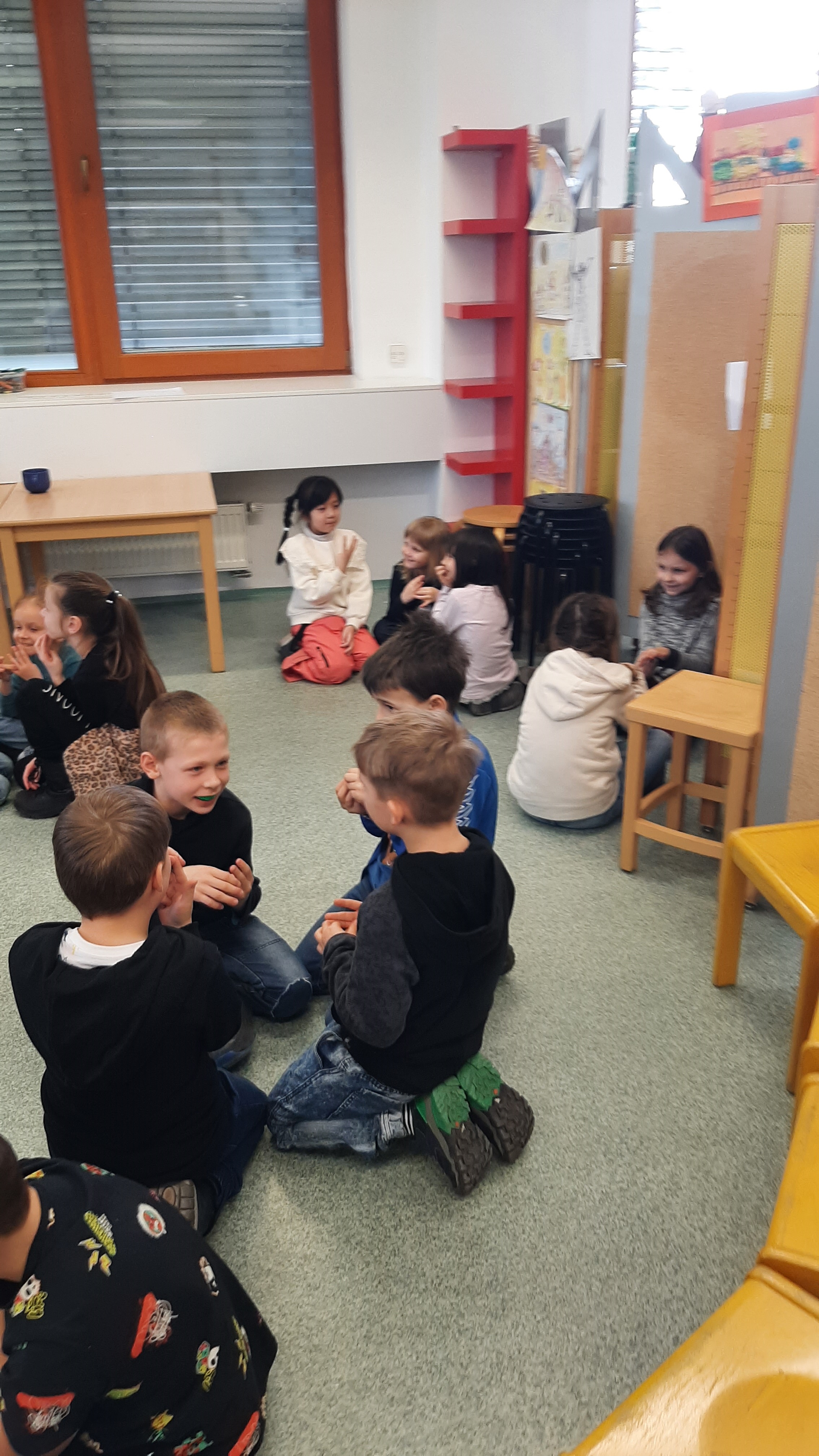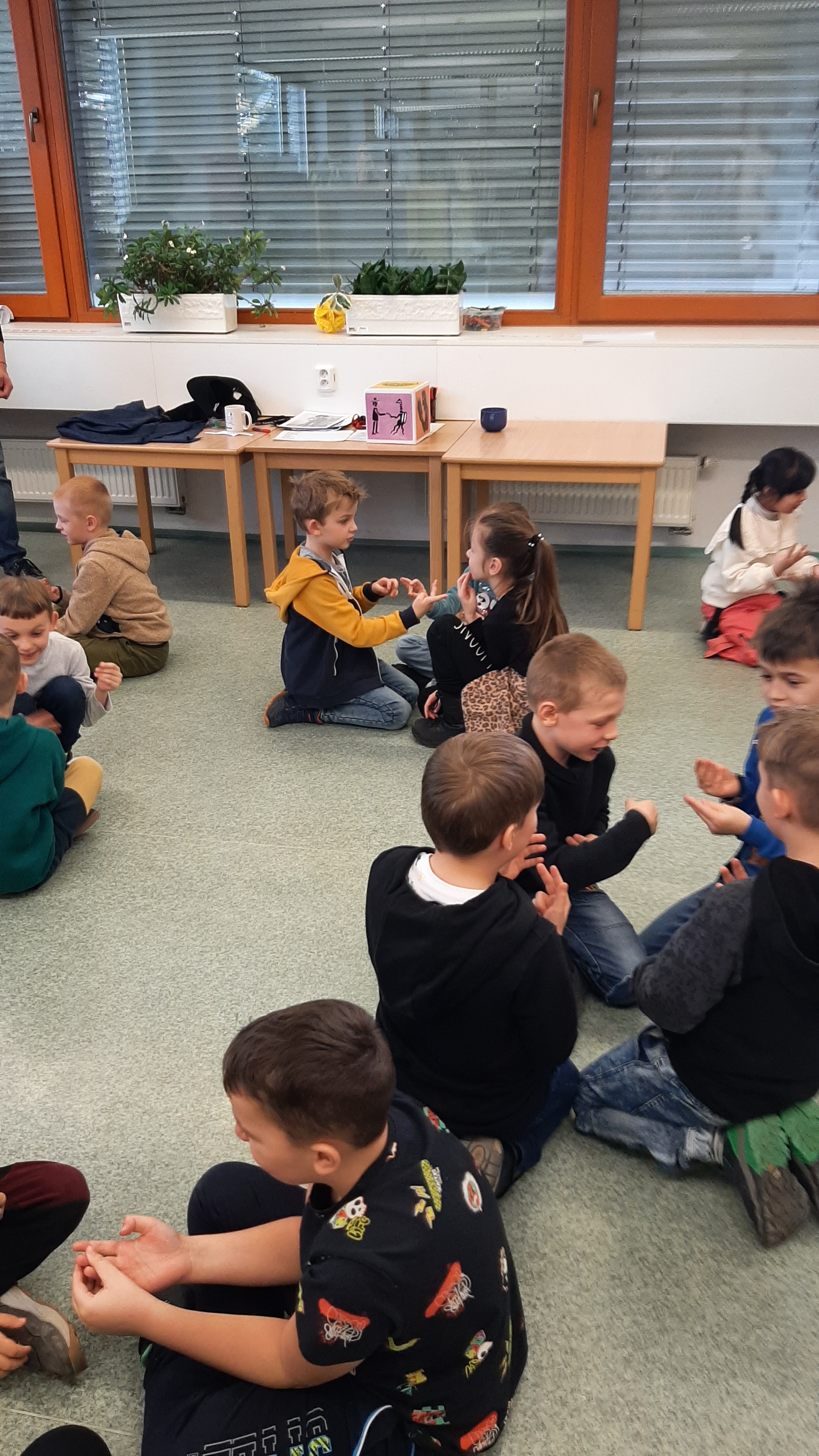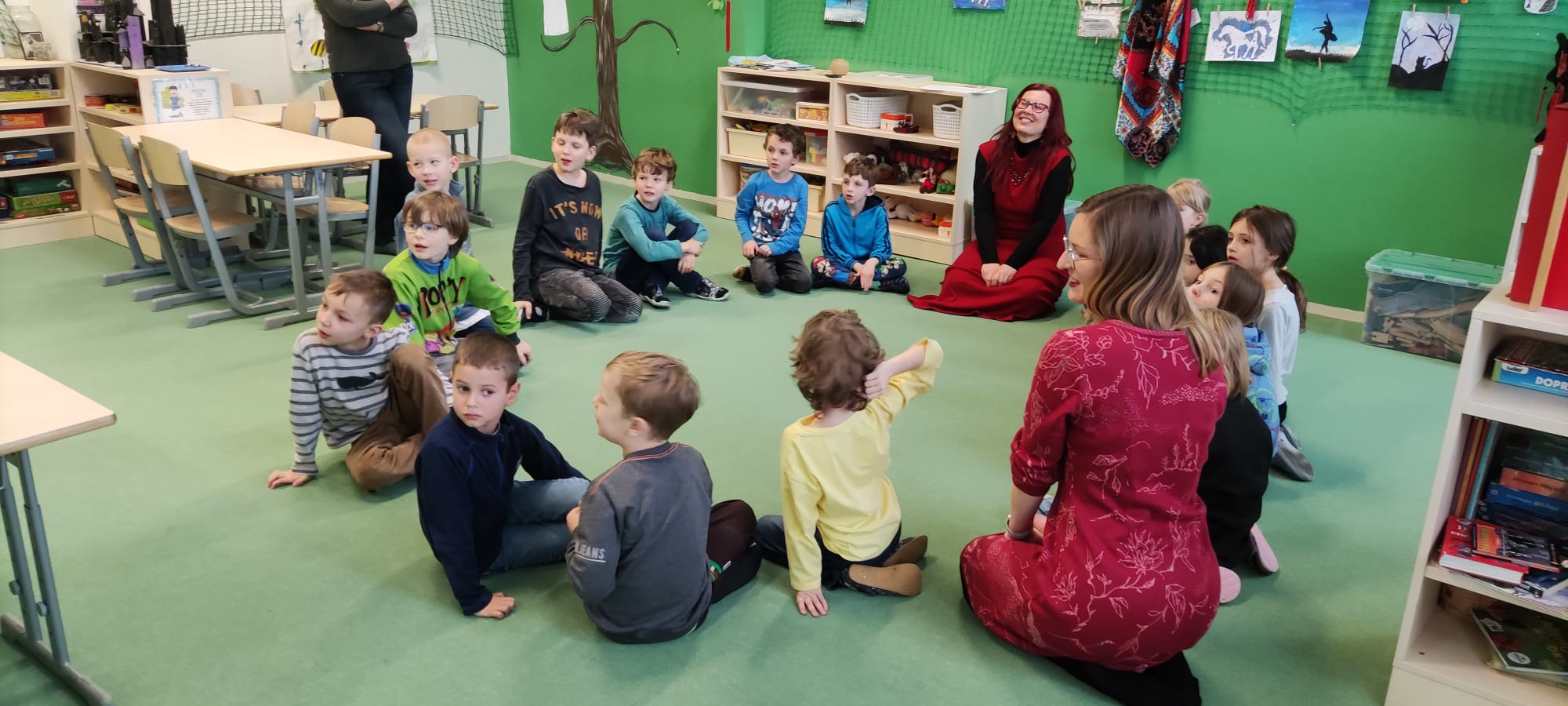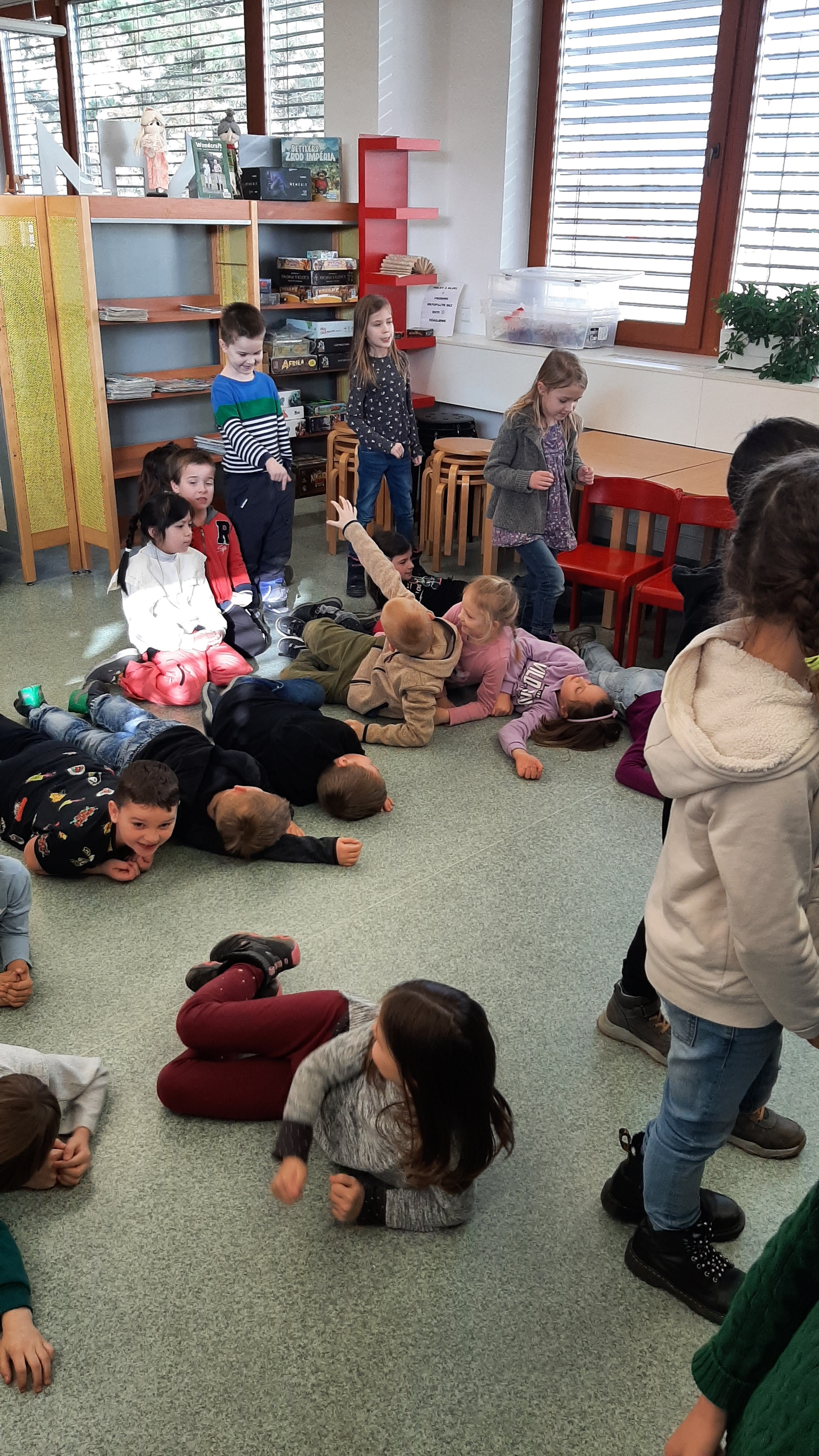 a) Relaxace, četba, odpočinek na koberci, klidové hry, vyprávění - dialog s dětmi.