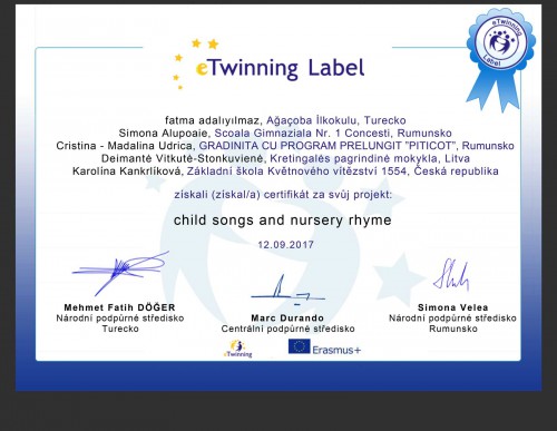 Třída 5.A je součástí evropského projektu ,,Child songs and nursery rhymes’’ , kde společně s dalšími školami sdílí písně ze svých zemí. Žáci se učí písně v jiném jazyku a následně společně sdílí své dovednosti. Díky projektu poznají nové kultury, zjišťují, že stejné melodie můžou mít jiný text, a že náš jazyk může být pro ostatní těžší, než se zdá. Vše je pod záštitou eTwinning.net, Erasmus+ a Evropské unie video1 Turkish song - 5.A zpívá turecky, video2 What’s Your Favorite Turkish Word?