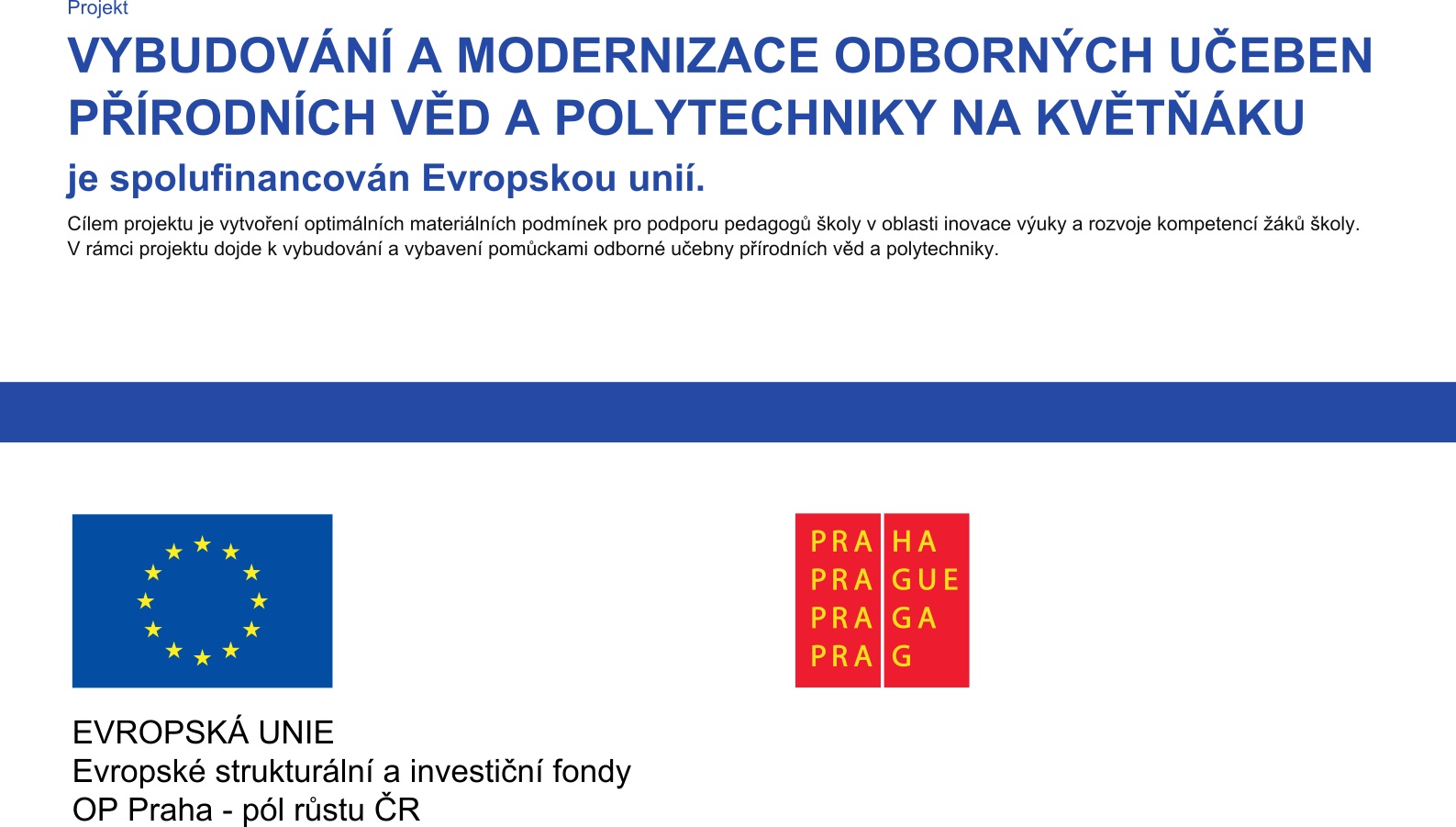 Anotace projektu: Předmětem projektu je vybudování odborné učebny přírodních věd a polytechniky na Základní škole, Praha 4, Květnového vítězství 1554.